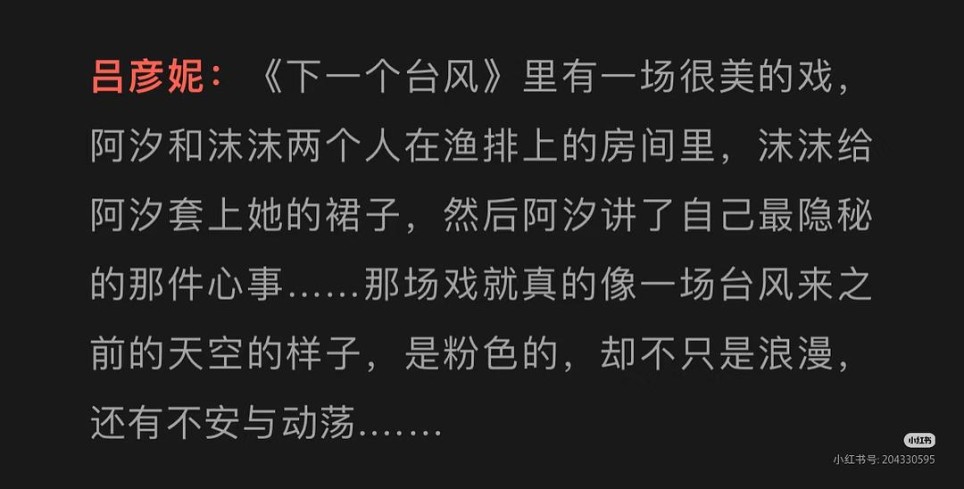 李玉在《下一个台风》中进一步强化了她的作者印记。她通过青蚵嫂与陈淑楠的角色展现了“受害者与加害者双重性”——青蚵嫂因丈夫侵犯阿汐母亲而污蔑对方,陈淑楠为维护家庭试图用金钱收买林沫沫。这种设定打破了简单的善恶二元论,揭示女性在父权结构下可能成为压迫同谋的复杂性。 正如李玉所言:"每个女性在受伤害的风暴里,都在拼命地自救,自救的方式各种各样......我特别希望大家看到的除了非黑即白的世界,还有很多很多的灰色地带。" 在视听语言上,李玉展现出成熟的作者控制力。日常戏用长镜头捕捉海岛时间的流动,创伤戏用快速跳接,高潮戏则回归静止长镜头,如林沫沫与阿汐在台风眼中对视的三分钟镜头,以风暴与平静的对比外化人物心理。 影片采用“去男性化”处理:施暴男性始终以背影或声音出现,焦点完全集中在女性群体的互动上。《下一个台风》提供了女性题材的杰出范例。它不靠惨烈画面虐女,而是以林沫沫口述侵害的留白更显揪心。影片以共情镜头聚焦女性间的深刻理解与扶持,让观众获得超越情绪宣泄的、真实而震撼的情感共鸣。